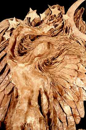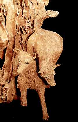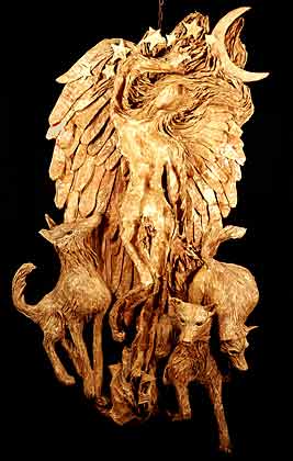 Lycanestra is one aspect of the goddess. In this avatar she is the mother of the night . Her scepter is the moon. Wolves gather at her feet as she rises out of the cauldron of fire. With one hand she blesses, with the other she condemns. She is formless so her figure is formless, negative space, a hallow core of paper mache. She represents that which is hidden, secretative and ineffable. She is the eternal mystery dancing with laughter at our attempts to understand the world. This one-of-a-kind hanging wall sculpture was created in 1997. I used brown paper bags that were soaked in a proprietary glue mixture. The soaked paper strips were wrapped around a steel armature. This work is for sale. The starting price is: $4000. |